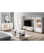 Oryginalna kolekcja mebli, która sprawi, że Twoje wnętrze stanie się nowoczesne i stylowe. Wszystko to za sprawą połysku na frontach, przełamanych dębowym kontrastującym akcentem.