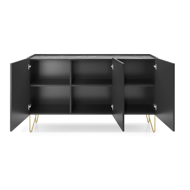 Nowoczesna komoda w kolorze czarny grafit + marmur black royal to połączenie elegancji czerni z naturalnym pięknem marmuru, tworząc harmonijną i wyrafinowaną estetykę mebla.