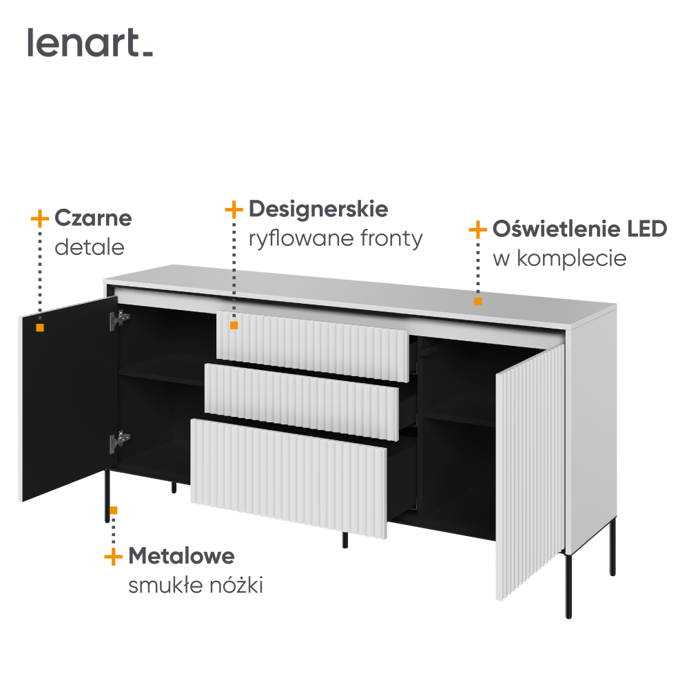 Biała komoda z czarnymi elementami posiada system PUSH-OPEN, metalowe nogi oraz trzy szuflady i dwie półki ukryte za drzwiami. Jej fronty ozdobiono ryflowaniem typu "półkole", dodatkowo podkreślonym oświetleniem LED, które dodaje elegancji. Szeroki blat stanowi idealne miejsce na dekoracje, a wnętrze komody oferuje dużo przestrzeni do przechowywania. Całość wykonana z trwałych materiałów, łączy nowoczesny design z praktycznymi rozwiązaniami organizacyjnymi.