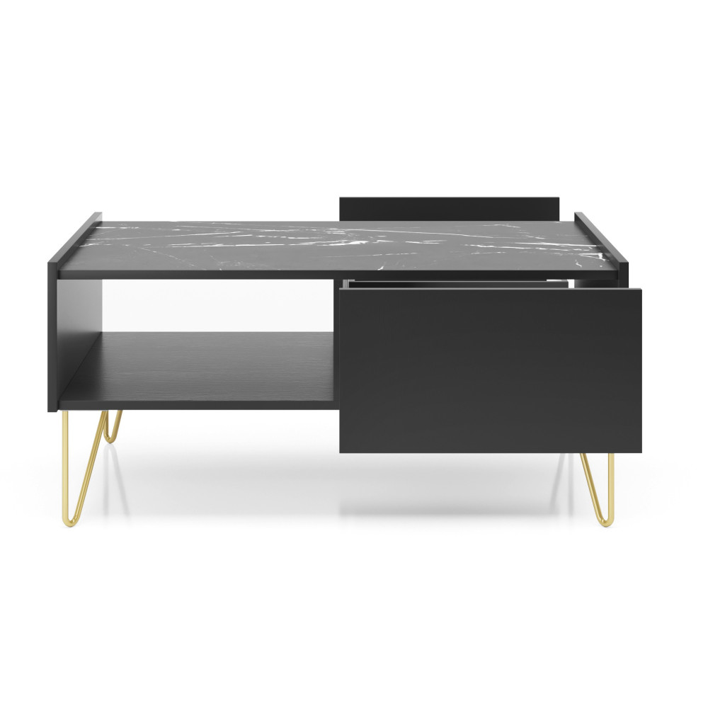 Nowoczesna ława w kolorze czarny grafit + marmur black royal to połączenie elegancji czerni z naturalnym pięknem marmuru, tworząc harmonijną i wyrafinowaną estetykę mebla.