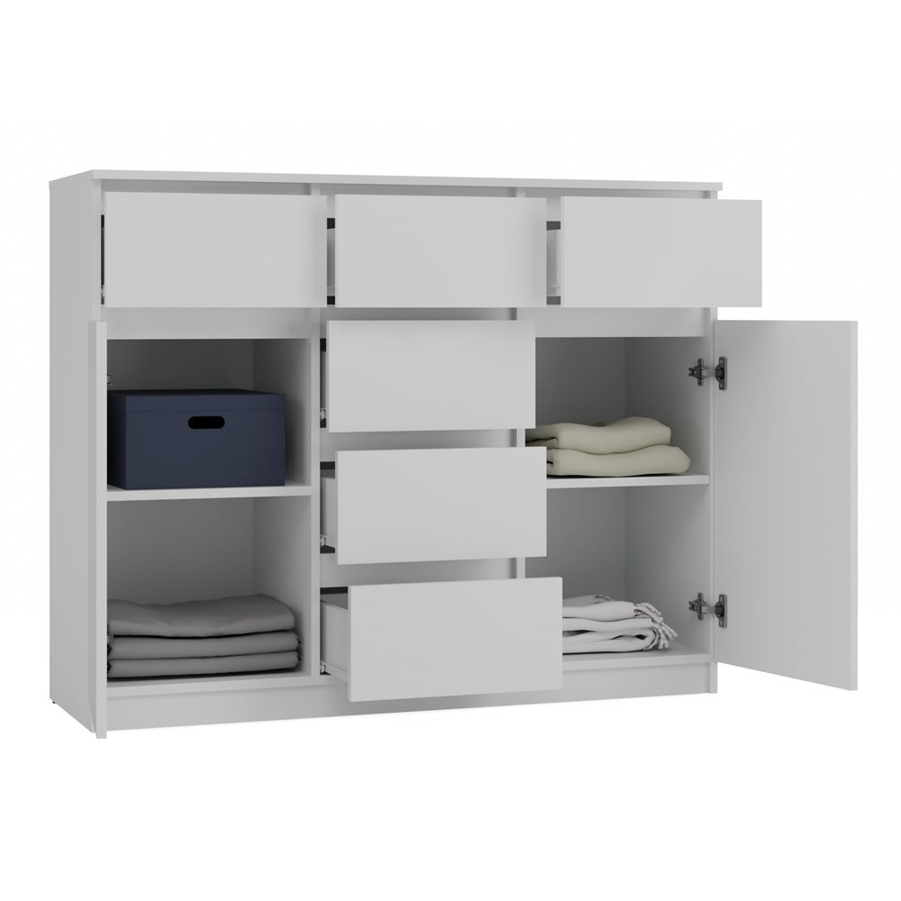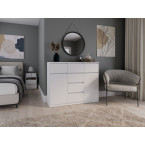 • Uniwersalny design: Prosta, elegancka forma komody w kolorze biel mat sprawia, że będzie pasować zarówno do nowoczesnych, jak i klasycznych aranżacji wnętrz. Bezuchwytowe fronty podkreślają minimalistyczny charakter, jednocześnie zapewniając wygodę użytkowania.