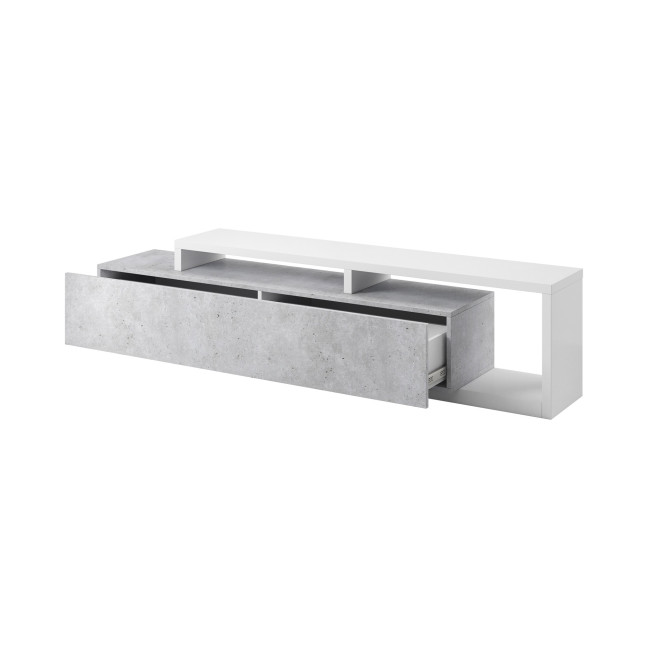 W skład zestawu wchodzą: Półka, witryna wisząca z półką i oświetleniem oraz komoda RTV.