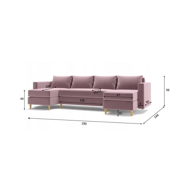 Narożnik Levi w kształcie litery "U" posiada drewniane nogi, pojemnik na pościel, funkcję spania oraz cztery poduszki.