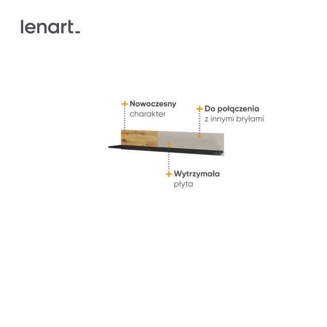 Nowoczesna półka wisząca to doskonałe połączenie stylu i funkcjonalności. Idealnie sprawdzi się jako miejsce na książki, dekoracje lub inne drobiazgi, pomagając w organizacji przestrzeni. Wykonana w eleganckim odcieniu dębu artisan, harmonijnie współgra z ciemnymi elementami inspirowanymi surową stalą, dodając wnętrzu nowoczesnego charakteru. Półka wyróżnia się prostą, geometryczną formą, która idealnie wpasuje się w nowoczesne aranżacje, a jej praktyczny design umożliwia łatwe przechowywanie i eksponowanie ulubionych przedmiotów.