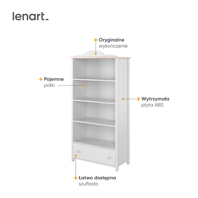 Regał w kolorze alpejskiej bieli z subtelnymi różowymi detalami to idealny wybór do wnętrz o romantycznym charakterze. Wyposażony w głębokie półki, które pomieszczą ulubione książki i zabawki, oraz pojemną szufladę, idealną dla dzieci. Jego unikalne wykończenie w formie delikatnej, miękkiej linii podkreśla lekki i elegancki styl mebla. Regał został wykonany z wytrzymałej płyty laminowanej, wykończonej trwałymi obrzeżami ABS, co zapewnia trwałość i odporność na codzienne użytkowanie.