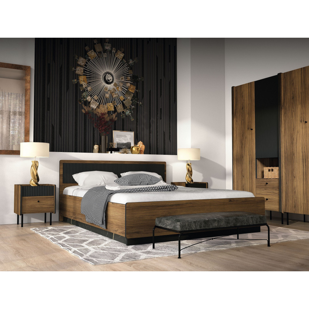 Zestawienie matowego czarnego koloru frontów z laminowaną płytą w dekorze orzech warmia i marmurowym blatem w kolorze san sebastian nadaje kolekcji niepowtarzalny wygląd i niezwykłość wzoru.