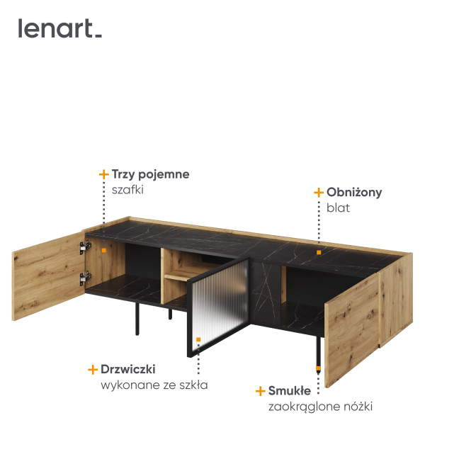 Szafka RTV o eleganckim i nowoczesnym stylu, osadzona na smukłych nóżkach, idealnie wkomponuje się w każde wnętrze. Posiada trzy pojemne szafki, które zapewniają dużo miejsca do przechowywania sprzętu i akcesoriów. Drzwiczki z ornamentowego szkła dodają jej wyrafinowanego charakteru. Dodatkowym atutem jest obniżony blat, który nie tylko pełni funkcję dekoracyjną, ale również zabezpiecza ustawione na nim rzeczy przed przypadkowym upadkiem.