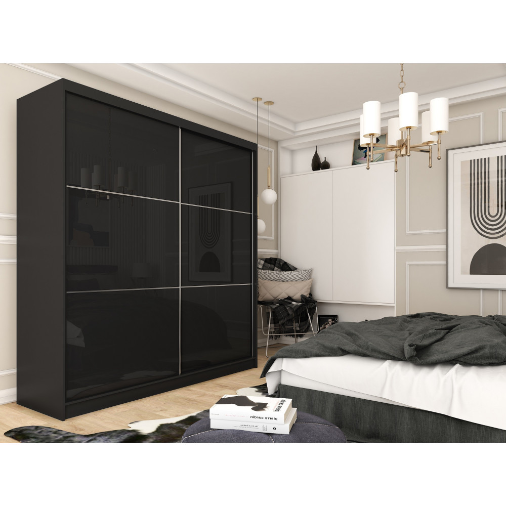 Szafa przesuwna z płyty laminowanej 16 mm. Szafa wyposażona jest w system jezdny zawierający aluminiowe prowadnice typu LAGUNA oraz kółka ułożyskowane