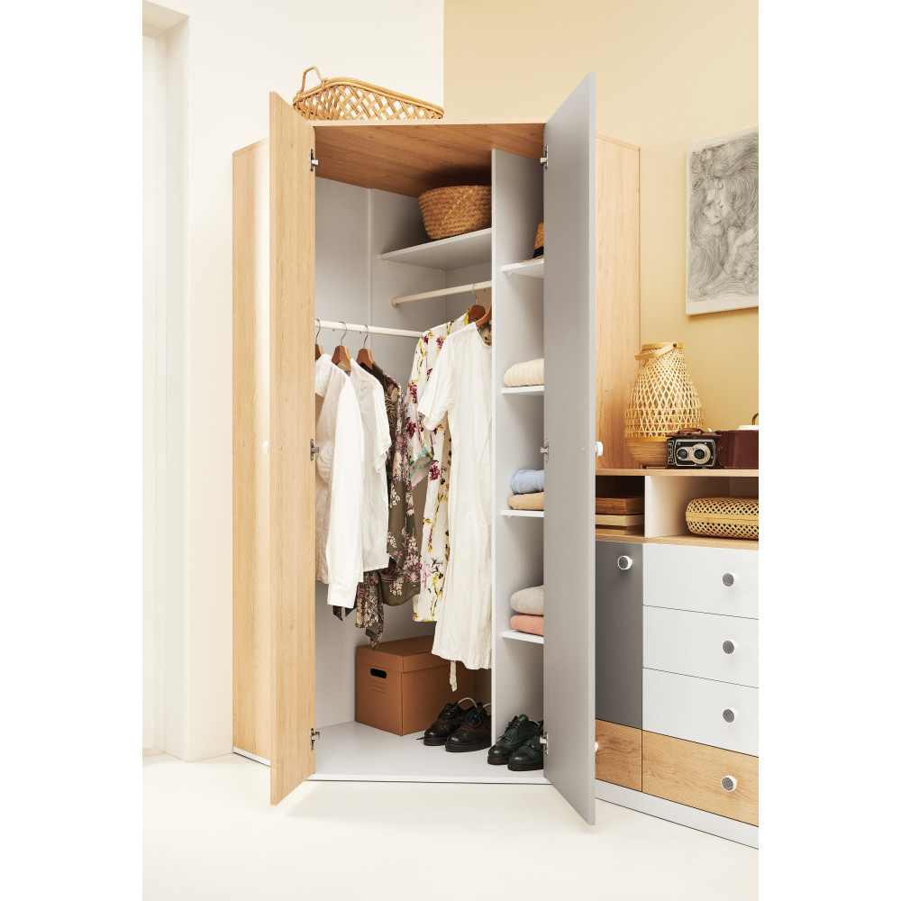 Dzięki połączeniu tych dwóch wysokiej jakości materiałów, Szafa Tetri jest nie tylko funkcjonalna, ale także estetyczna i trwała, będąc idealnym rozwiązaniem do przechowywania ubrań i innych przedmiotów w Twojej przestrzeni mieszkalnej.