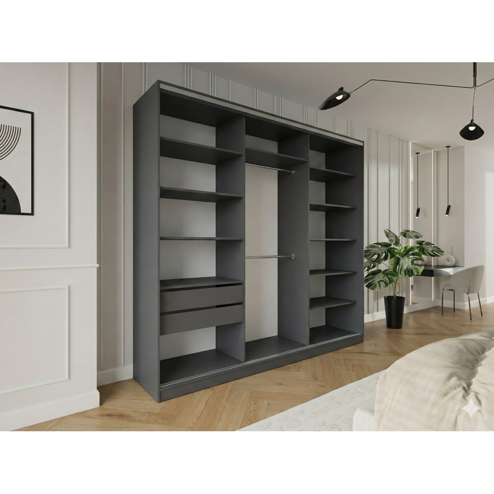 Szafa oferuje możliwość zamontowania dodatkowych półek w miejscu przeznaczonym na wieszaki – klient decyduje o ich rozmieszczeniu podczas montażu. W przypadku wyboru 2 dodatkowych szuflad, klient ma możliwość określenia zarówno ich wysokości, jak i strony montażu (lewa lub prawa) – decyzja podejmowana jest podczas montażu. Przy wyborze 4 szuflad możliwy jest wybór jedynie ich wysokości, zgodnie z prezentowanymi zdjęciami – również ustalany podczas montażu.