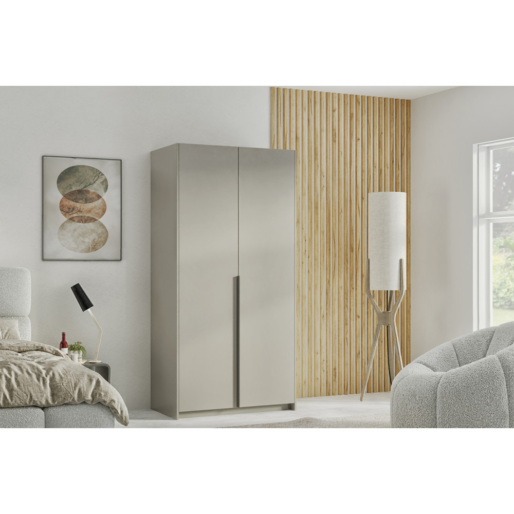 Szafa Lara w odcieniu kaszmiru to propozycja łącząca minimalistyczny design z wysoką funkcjonalnością. Jest to model o szerokości 100 cm, co czyni go rozwiązaniem dedykowanym do mniejszych sypialni, przedpokojów lub jako uzupełnienie większego systemu przechowywania. Na innej aukcji dostępna jest też szafa Lara o szerokości 150 cm.