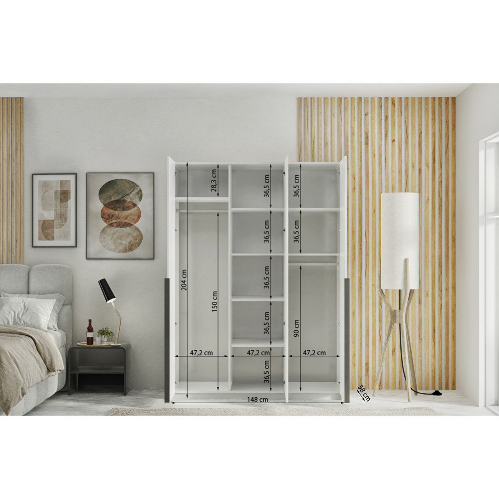 Szafa Lara w odcieniu biały mat to propozycja łącząca minimalistyczny design z wysoką funkcjonalnością. Jest to model o szerokości 150 cm, co czyni go rozwiązaniem dedykowanym do mniejszych sypialni, przedpokojów lub jako uzupełnienie większego systemu przechowywania. Na innej aukcji dostępna jest też szafa Lara o szerokości 100 cm.