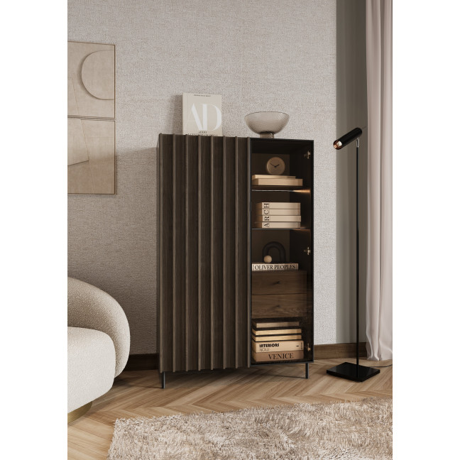 Wbudowane oświetlenie dodaje meblowi elegancji, subtelnie eksponując piękno przechowywanych przedmiotów. Dzięki nowoczesnemu designowi, witryna stanie się efektownym akcentem w każdym wnętrzu. Smukłe metalowe nóżki i delikatne lamele nadają lekkości, a oryginalne połączenie koloru jesion portland z czernią idealnie wpisuje się w aktualne trendy.